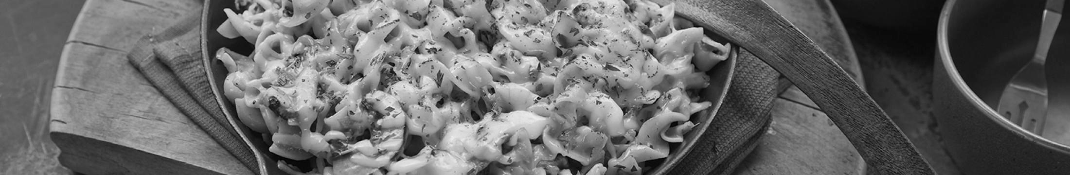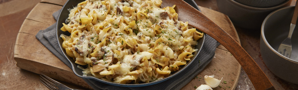 - Remove skillet from heat and stir in sour cream. Add cooked egg noodles and mix until well combined. Top with grated gruyere. If using an ovenproof pan, bake in a 400-degree F oven until cheese is melted and slightly browned. Otherwise, leave on the stovetop over medium-low heat, cover, and heat until cheese melts. Top with parsley and serve immediately.